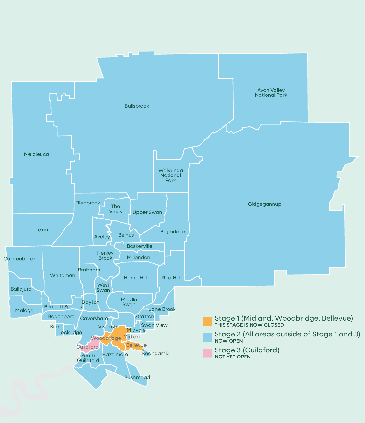 We recently completed Stage 2 of the Local Heritage Survey (LHS) and Heritage List review for all areas, except Guildford, Midland, Bellevue and Woodbridge.The LHS review is conducted in 3 stages as depicted in the map below to allow for a detailed review of each area.